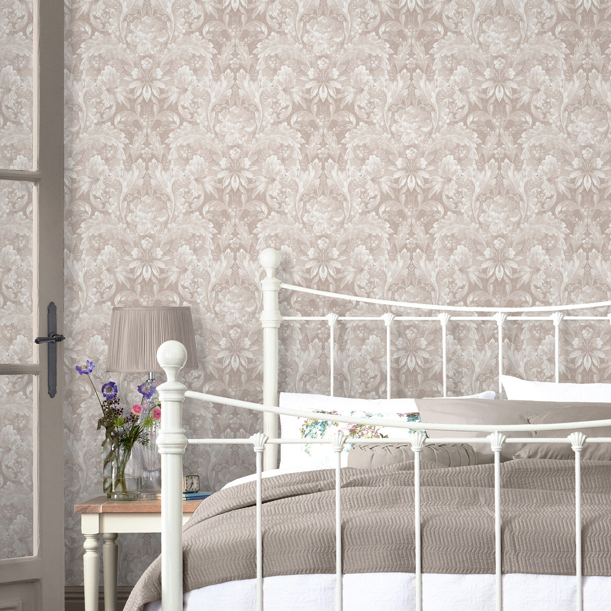 Timeless and elegant, this ornate damask print features curling acanthus and leaves that form the design around primula, primrose plants, roses and peony flower heads.