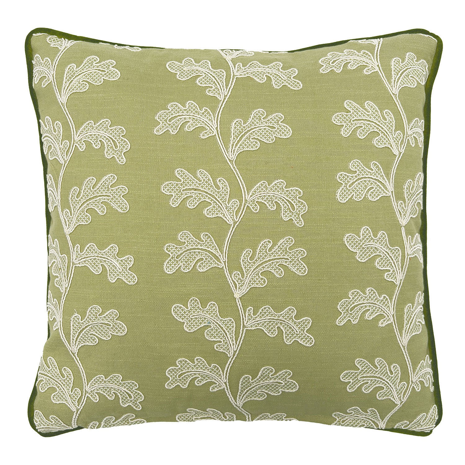 Part of Linwood’s Titania collection, the Helena Embroidered Cushion in Canopy by Linwood features a striking oak leaf motif, intricately stitched in pure white thread using the traditional couching technique. Set against a green cotton-linen ground, the embroidery feels both bold and timeless. The pattern is shown on both sides and finished with a plush velvet trim; this designer cushion brings richness, craftsmanship, and quiet luxury to any interior scheme. 43cm x 43cm Dry Clean Only Duck Feather Pad |