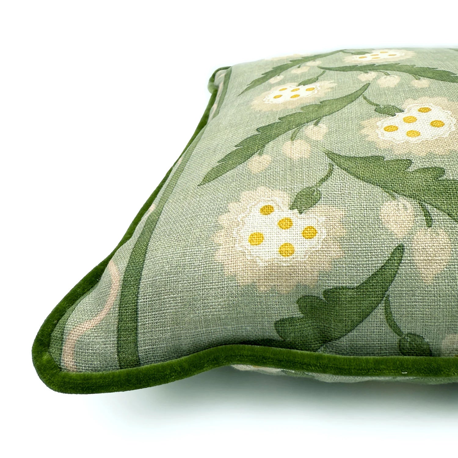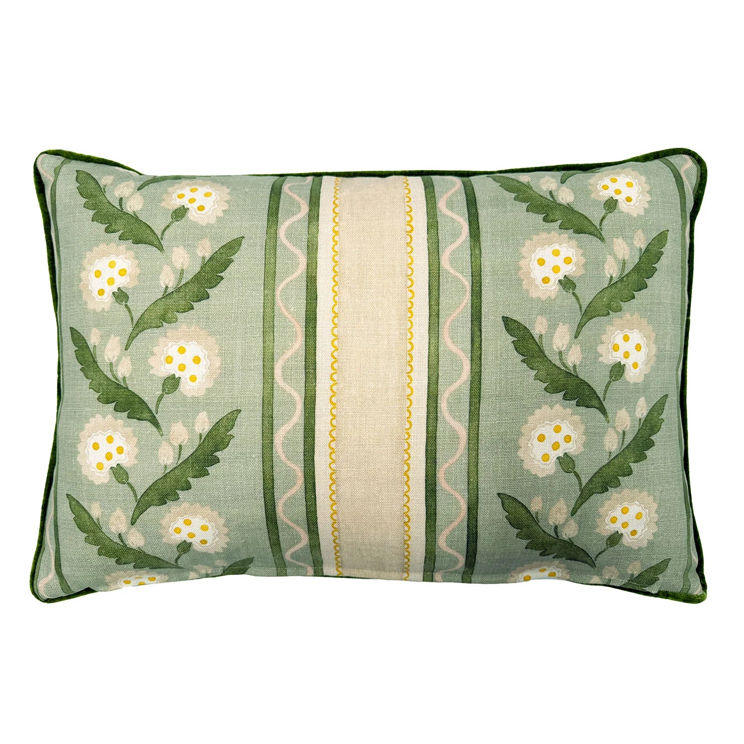 Polly Stripe Moss Cushion features a charming botanical stripe, with stylised dandelions framed by soft green bands and a gently undulating border. Printed on both sides on pure linen in calming moss tones, this cushion is finished with smart piping and a hidden zip - a thoughtful design that brings character to your soft furnishings.