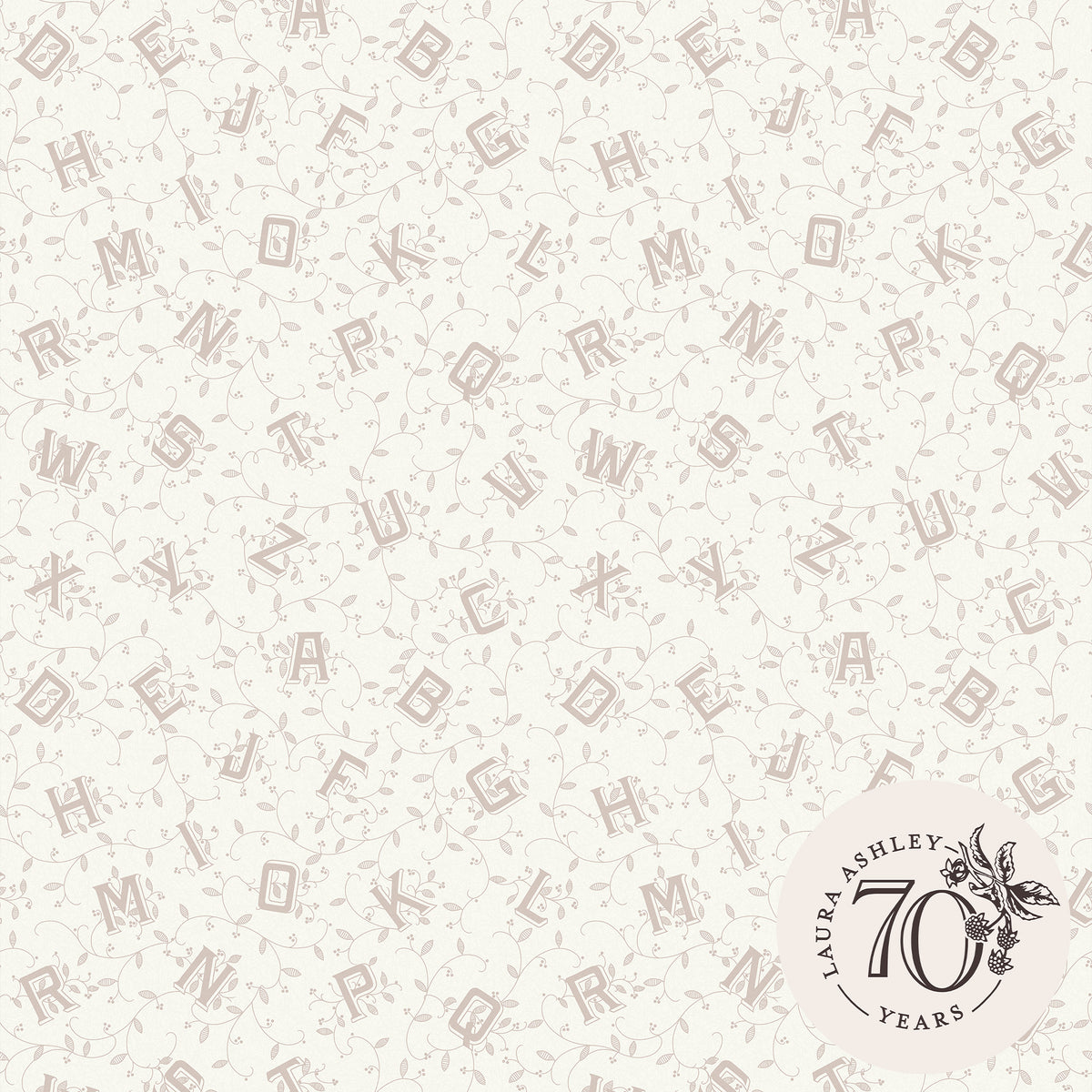 Offering both style and substance, this timeless alphabet print is set on a neutral palette. Originally added to the Laura Ashley archive in 1991 as a Mother and Child wallpaper, this charming design features letters of the alphabet among trailing stems and sprouting berries.