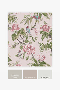 Birds and Blooms is a beautiful floral wallpaper with majestic birds perched upon branches. This gorgeous colour palette features pops of fresh greens and romantic pinks sat upon a muted pink ground. Printed on a matt paper this elegant design has a luxurious finish whilst also being paste the wall making this wallpaper easy to hang.